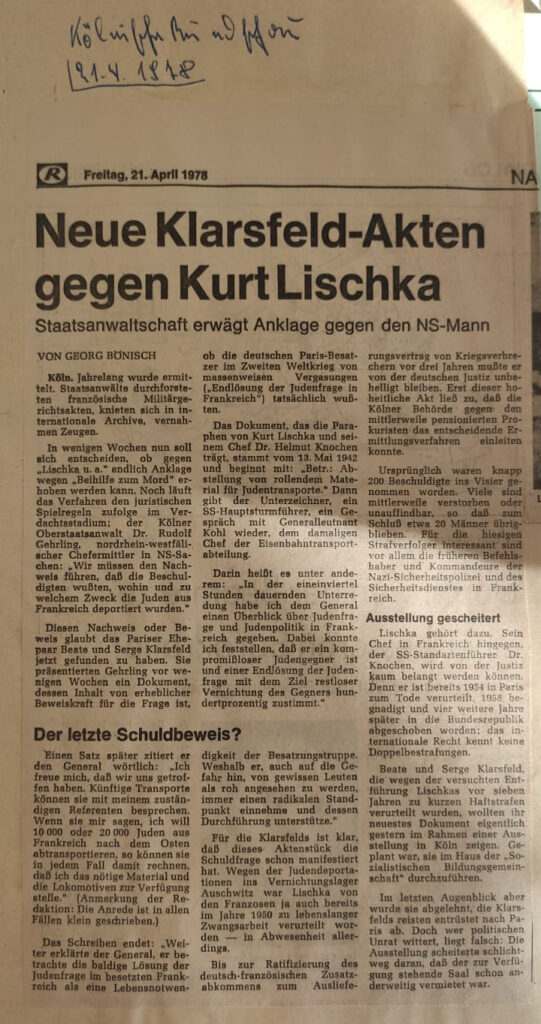 Im Laufe der 1970er Jahre wurde Köln immer wieder zum Schauplatz von Aktionen der Militants de la Mémoire/FFDJF.[1] Der Rechtshistoriker Martin Rath kommentiert die Zeit zwischen dem Prozess gegen Beate Klarsfeld im Frühjahr 1974 bis zum Beginn des „Lischka-Prozesses“ im Oktober 1979 folgendermaßen: „Ehemalige KZ-Häftlinge, die im Gerichtssaal die ‚Marseillaise‘ singen? Franzosen im KZ-Drillich vor dem Gebäude? Die Jahre 1974 bis 1979 waren für die Kölner Justiz aufregende Zeiten.“[2]